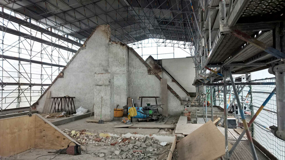 In dem gerade fertiggestellten Nachverdichtungsprojekt im Block Braystrasse und Versaillerstrasse baut Palais Mai die Dächer der Blockrandbebauung aus. Die Baustelle ist gerade mit einem sehr großen neuen Dach gestartet.