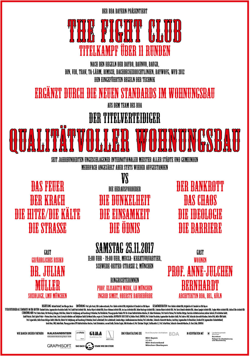 Fight Club verzichtet gänzlich auf das herkömmliche Format einer Podiumsdiskussion und setzt stattdessen auf Dynamik. In Form eines verbalen Boxkampfes tritt der Titelverteidiger Qualitätvoller Wohnungsbau in elf Fights gegen seine wohlbekannten Gegner Feuer, Krach, Hitze, Kälte etc. an. Während der einzelnen Runden wird der Titelverteidiger je von Fachleuten (sog. Cornermen) unterstützt und versucht sinnvolle Regeln auszuloten, um neue und erfolgsversprechende Strategien für den Kampf gegen die Gegner des qualitativen Wohnungsbaus zu entwickeln. Unter anderem mit Prof. Anne-Julchen Bernhard (BeL Sozietät für Architektur, Köln), Matthias Böttger (Künstlerischer Leiter DAZ, Berlin), Prof. Gerhard Hausladen, Prof. Regine Keller (Keller Damm Kollegen GmbH, München), Prof. Andreas Hild (Hild und K, München), Cornelius Mager (Leiter Lokalbaukommission, München), Prof. Dr. (I) Elisabeth Merk (Stadtbaurätin der Landeshauptstadt München), Dr. Julian Müller (Lehrstuhl Soziologie Prof. Dr. Armin Nassehi, LMU München), Christian Stupka (Vorstand GIMA München e.G.), Prof. Christiane Thalgott (Stadtbaurätin a.D., München) u. v. a. m.