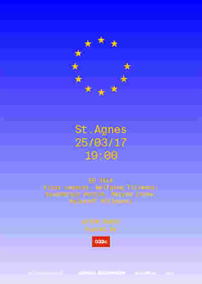 Am 25. März 1957 wurden die Römischen Verträge – die Grundlage der heutigen Europäischen Union – unterzeichnet. Anlässlich dieses 60. Jah- restages findet am 25. März 2017 in St. Agnes eine Veranstaltung statt, die sich mit Fragen zur Zukunft der Europäischen Union beschäftigt. In Zusammenarbeit mit morePlatz setzte die in St. Agnes beheimatete KÖNIG GALERIE im letzten Jahr ein Zeichen, als an der Fassade der ehemaligen Kirche eine EUROPA-Lichtinstallation angebracht wurde.