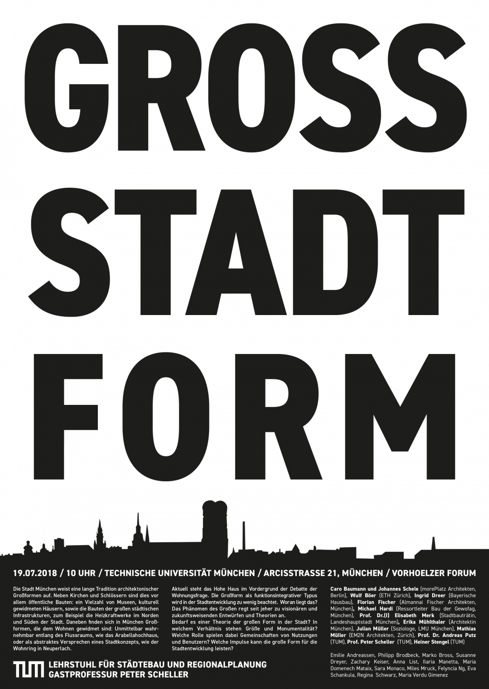 Die Stadt München weist eine lange Tradition architektonischer Großformen auf. Neben Kirchen und Schlössern sind dies vor Infrastrukturen, zum Beispiel die Heizkraftwerke im Norden und Süden der Stadt. Daneben finden sich in München städtische Großformen, die dem Wohnen gewidmet sind: Unmittelbar wahrnehmbar entlang des Flussraums, wie das Arabellahochhaus, oder als abstraktes Versprechen eines Stadtkonzepts, wie der Wohnring in Neuperlach. Aktuell steht das hohe Haus im Vordergrund der Debatte der Wohnungsfrage. Die Großform als funktionsintegrativer Typus wird in der Stadtentwicklung zu wenig beachtet. Woran liegt das? Das Phänomen des Großen regt seit jeher zu visionären und zukunftsweisenden Entwürfen und Theorien an.