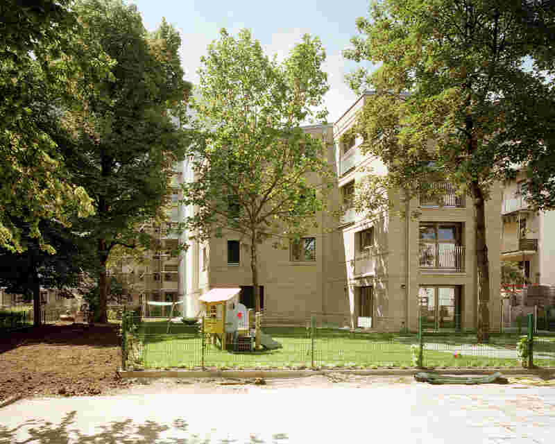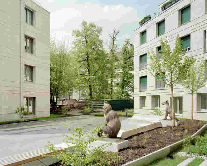 The new buildings adapt to the conditions of the site and the tree population and take into account the distance to the existing buildings. At the same time, they create new, differentiated spaces that make the entire courtyard permeable and thus experienceable, but also define new places. The courtyard is rezoned. The more quiet garden courtyard remains free of development, while the livelier courtyard on the east side of the ensemble serves to provide access to the houses and is more strongly paved. The passage between the buildings is a narrower space that contrasts with the rest of the courtyard.
