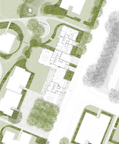 The building field forms its character from the tall buildings. This spatial sequence is strengthened by the placement of new buildings and forms a new rhythm on Appenzeller Strasse. Clearly defined, spatially defined new subspaces are created that offer appropriate space for public uses. The distinctive edge of the city is continued by the placement of new point buildings, which complement the row and strengthen the diagonal spatial reference.