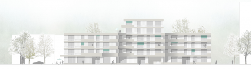 The new buildings to the west of Appenzeller Strasse specify the urban characteristics and typologies found and described by mediating between the street and the neighbourhood's in-depth landscape space and marking an entrance to this landscape space on the street. The demand for a high mix of uses and flat sizes is implemented in this building. On the ground floor, facing south, there is a café, a community hall and a community gallery, and in the northern part of the building there are studio flats with studio rooms facing the street. The building consists of 3 structures. Each structure has its own entrance and staircase. A mixture of 1.5 - 4-room flats is oriented mostly on two sides to an open-air area. The street side is clearly structured and urban in appearance, while the west side offers reliefed, stepping open spaces to the landscape. As a special feature, the building also offers communal loggias on the stairwells and a communal terrace.