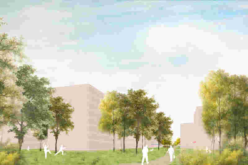 The chains of east-west oriented buildings are an interpretation of existing building forms and directions. The open spaces created between the building volumes differ in dimension and form. They thus create differentiated spatial experiences and respond to different functional requirements. The result is an alternation of wider, public, park-like green spaces with narrower intermediate spaces dedicated to predominantly residential use with private greenery and the addressing of the individual buildings. Clearings in the northern tree population allow views into Engelhaldepark. This creates a permeable structure between the park, the neighbourhood and the district with varied open-space qualities.