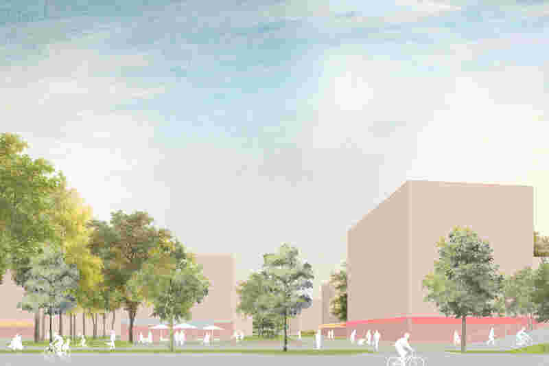 A neighbourhood square on the eastern part of Leonhardstrasse picks up on existing traffic links. Both the new neighbourhood and the existing park are given an appropriate prelude. Existing cycle and footpath connections, starting from the pedestrian bridge junction in the south-east, are continued here into the new quarter and directly connected to the new uses of local supply and childcare.