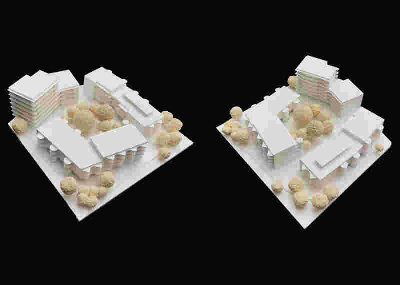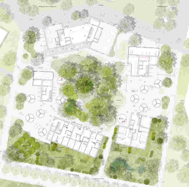 The design presented defines a simple yet differentiated structure of related yet different houses around a common yet open courtyard space. The fact that the courtyard is not built underneath makes it possible to create a dense, tree-lined interior to which the three houses relate.