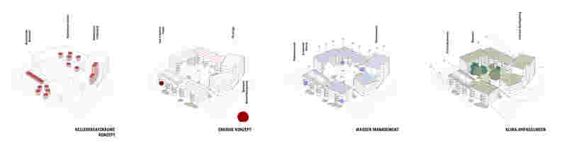 The courtyard is also defined by the different heights of the buildings. The different references of the houses to the courtyard via open spaces or arcades as well as from the communal, partially open ground floor create diversity in the relationships between the zones. The design formulates a balanced relationship between security and community and an open perspective to the neighbourhoods and the southern landscape.