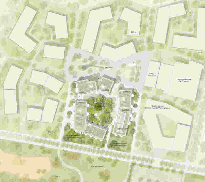 At the interface between the climate boulevard in the south and the village square in the north, the residential courtyard acts as a mediating element. Dynamic spatial sequences interweave inside and outside, lush green structures flow around the different zones of use. Flowering meadows and fruit orchards, framed by field copse structures, define the western section of the southern cultural landscape. The open transition from the private outdoor areas leads the residents to the community garden; gardening and experiencing nature become a matter of course.