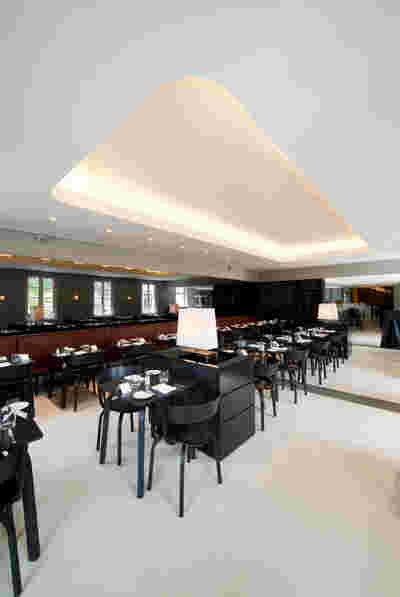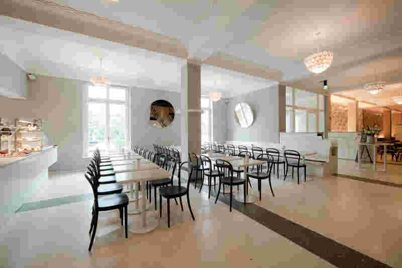In the face of the many spatial qualities of the restaurant as well as its size, it was subdivided into different areas, each with its own character and atmosphere. Coherence is achieved by the end-to-end light terrazzo floor, large mirrors behind the fireplace, in the dining room and behind the bar connect and expand the rooms.
