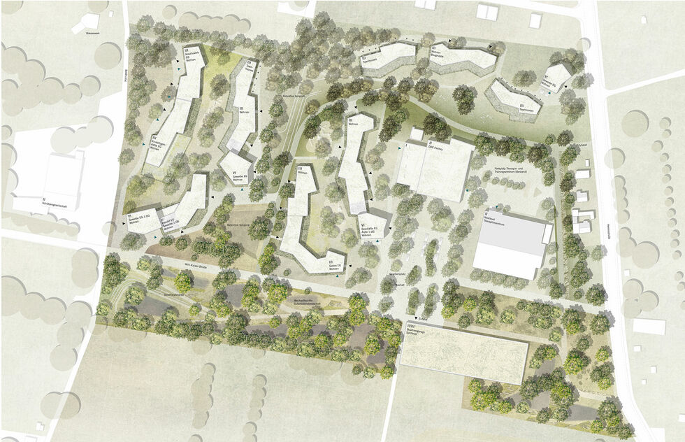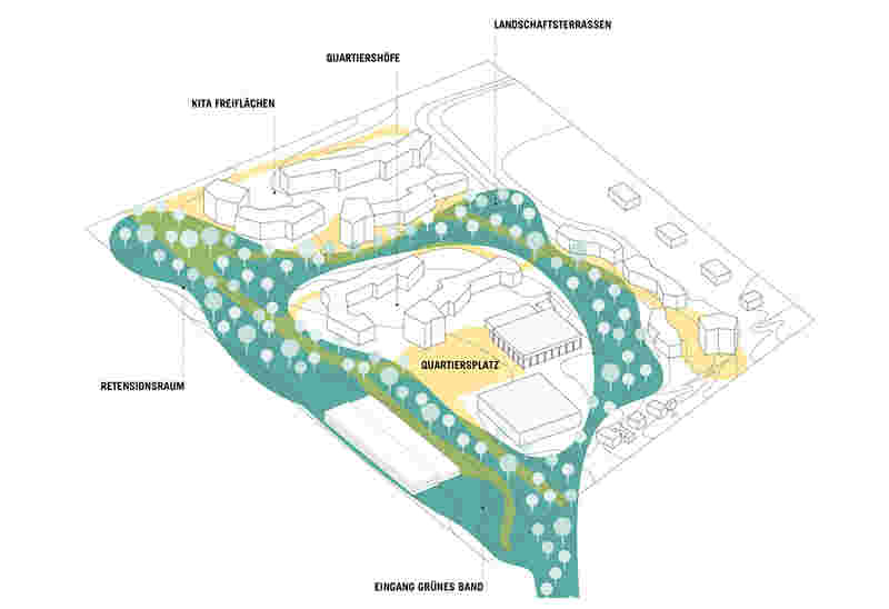 The new quarter, situated above Bellevue, will in future occupy a prominent position in Schweinfurt's existing urban space. As a reinterpretation of the previously closed-off area of the Kessler Field in a special location above the Main Valley, it stands for a civilising development of the community in a special landscape location. The existing topography is a determining factor in the spatial organisation of the new settlement structure.