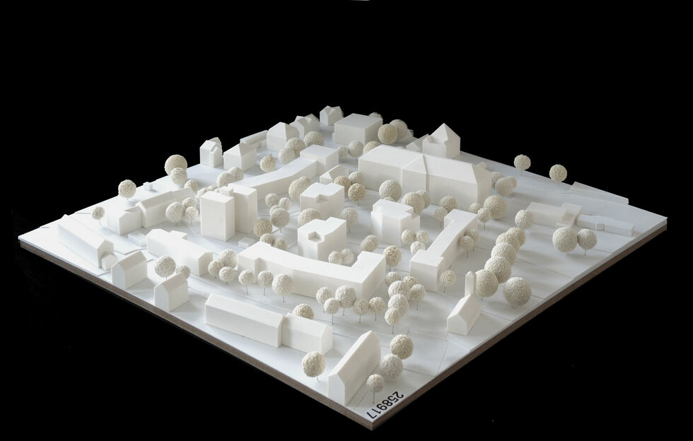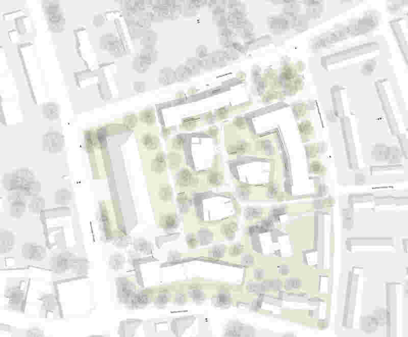 The western perimeter development forms the edge of the forecourt at the chapel in the north and creates the transition between the public outside and the more private inside. The head in the south establishes a spatial reference to Adalbert-Stifter Weg and mediates spatially with the residential development in the east of the area. The freestanding point houses in the interior of the quarter relate to the point house in the south on Gerhart-Hauptmann Strasse, which thus becomes part of the new ensemble.