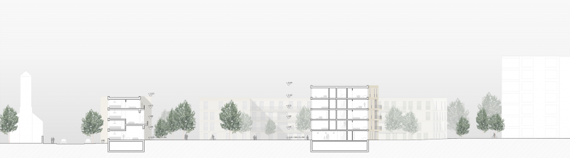 Between the head buildings in the north of the perimeter, two-, three- and four-bedroom flats with corner lighting are inserted as storey flats. The living spaces in the south will be 1.5 storeys high and open up to the south. The loggias, also 1.5 storeys high, form generous open spaces and create special room situations. On the top floor, a continuous band of balconies extends in front of the flats, creating a staggered height development on the one hand and a differentiated range of open spaces on the other.