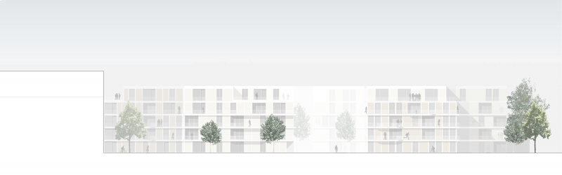 Five-storey buildings, which are stepped down to four storeys towards the courtyards depending on the location, form the basic building blocks of the structure. Views are framed, passages are created and form clear addresses on Theresienstrasse.