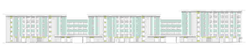 Taking into account the aspects of sustainability, as well as the time constraints of the project, the development will be realised in a timber hybrid construction. The architectural approach is based less on individual details and more on the interaction of the individual parts to form an effective overall sum. Here, the focus of the design is on the readable joining of these elements, the different structures of the façades, the similar but not identical houses, differentiated building heights, as well as the generous passageways. The colour accents and structures of the cladding, which vary in nuances, the slightly jumping relief of the exterior walls and balconies also contribute to creating spatial density and complexity in the sense of a lively neighbourhood identity. Another defining element is the wide cantilevered roof surfaces and pergolas, which not only serve to technically maximise solar gain, but also make the theme of sustainable neighbourhood supply visible and tangible to the outside world.