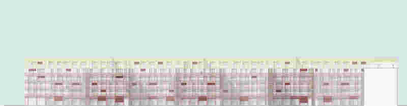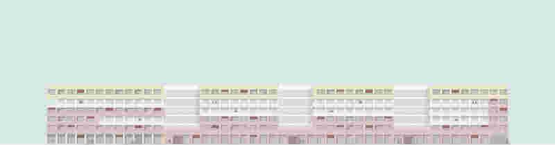 The courtyard façade is given its own character with a steel structure for the balconies. This simple framework will be the generous exterior space of the flats and will have a high recognition value due to the coloured paint.