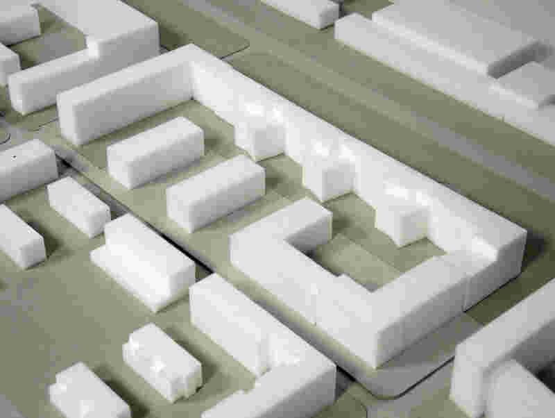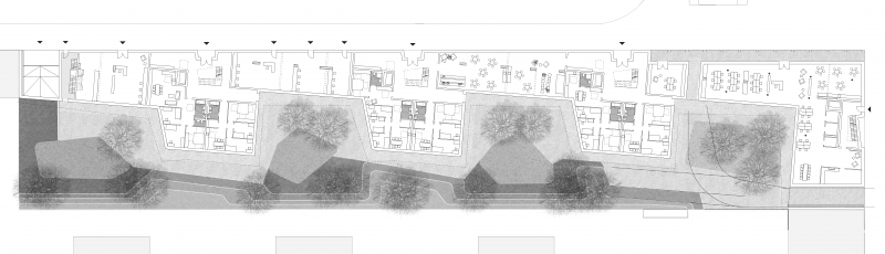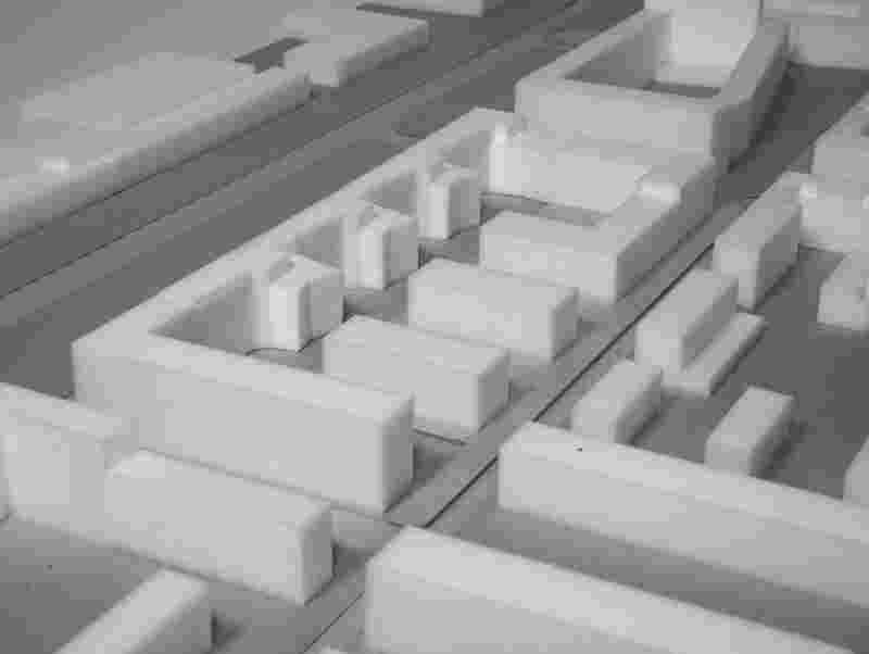 The long and rather narrow plot for the future RIO development along Willy-Brandt-Allee has a much higher residential quality to the south and towards the courtyard due to its orientation and the exhibition centre to the north. This is where most of the living should be oriented, i.e. the flats. To this end, the "surface" will be extended to the south. The annexes, which are rather like back buildings in the development plan, will be shaped into large stately houses - really thick houses. The ensemble presents itself as a coherent house/conglomerate with as many different qualities and places as possible, despite the somewhat monotonous plot.