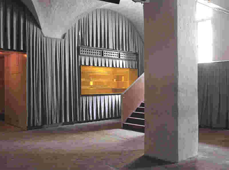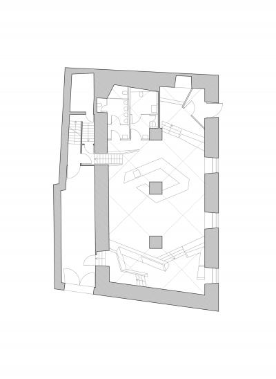 Volumes coated with black rubber sheets were built into the dominant vault of the basement, which are based on their own polygonal geometry as a counterpoint to the existing vault.