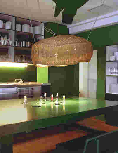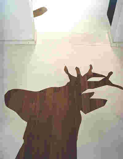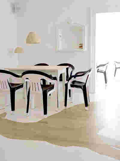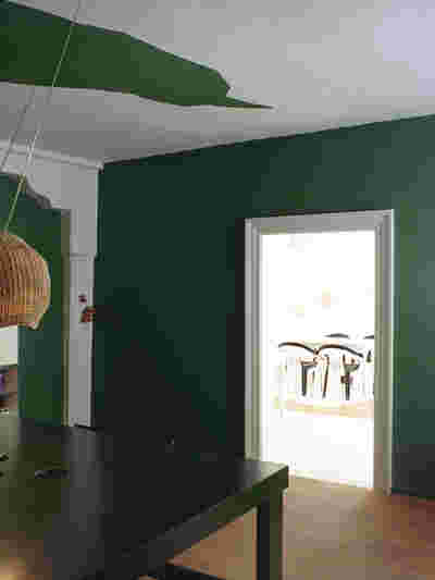 The rooms on the top floor are reminiscent of a flat, a sequence of rooms with a view of the city. The first room, with a large table, resembles a kitchen-living room; in contrast to the bright guest rooms, it is dark green. The various guest rooms are named after local animals: Hare, Bear, Thrush, Deer and Cow, which appear as silhouettes on the otherwise white lacquered parquet floor.