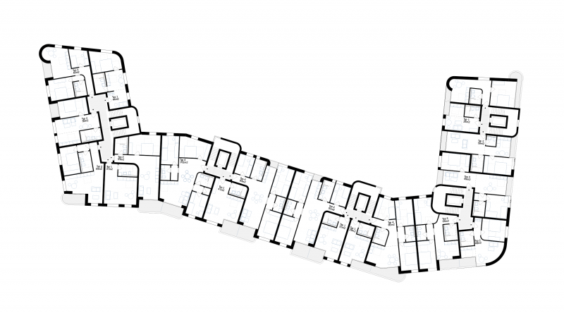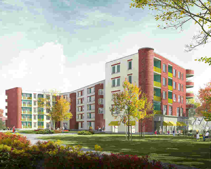 Das Projekt unterscheidet deutlich zwei Welten: im Inneren gibt es einen großen gemeinschaftlichen Hof der von allen Häusern genutzt wird. Die Fassade ist hell und freundlich und verzichtet auf den Klinker der Außenseiten. Nach Außen zeigt sich die Bebauung individueller und markanter, die Rundungen des Städtebaus werden betont. Die horizontale Gliederung unterstreicht die Besonderheiten der „schwingenden“ Geometrie, Balkonloggien entwickeln sich aus dieser heraus oder treten nicht aus der Fassadenebene heraus.