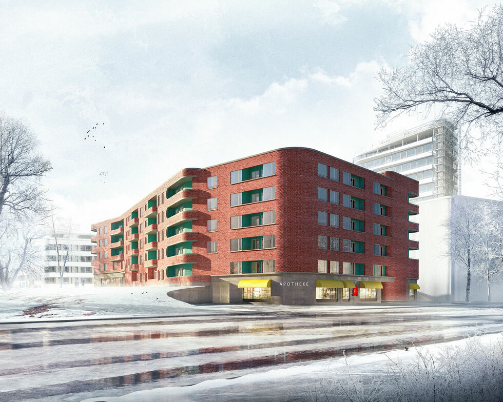 Es ist unser Anliegen dort hochwertige Konstruktionen vorzuschlagen wo viele davon profitieren: So wird der Klinker im Wohnhof als Schmuckelement und nach außen, in den Öffentlichen Raum, vollflächig eingesetzt um dem Bauwerk mehr Prägnanz zu verleihen. Das Zusammenspiel mit der hellen Supermarktfassade macht aus den beiden Bauwerken ein Hofensemble. Die Materialität der Gesamtbebauung bezieht sich immer wieder aufeinander - das Ensemble spielt mit dem individuellen Ausdruck und bleibt doch eine Familie.