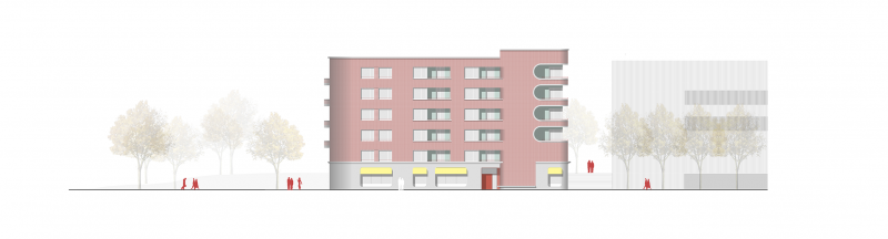 Im Erdgeschoß des Baukörpers schafft der Sockel eine Verbindung zum Aldi Gebäude, sowohl über die (gewerbliche) Nutzung als auch über das Material: eine Sichtbetonfassade mit großen Öffnungen und einer Freitreppe die ins neue Quartier führt. Neben diesen Aspekten ist der gemeinschaftliche Hof eine wichtige Qualität für das MI. Der Hof ist so groß wie möglich – der Schubladenartige Bauteil des Bebauungsvorschlages der Kita ist in den 5- geschossigen (zur Straße 6- geschossig) Baukörper integriert. Das Haus für Kinder erstreckt sich über zwei Geschoße im Westen der neuen Hofbebauung. So bleibt viel Freiraum für die Gemeinschaft.