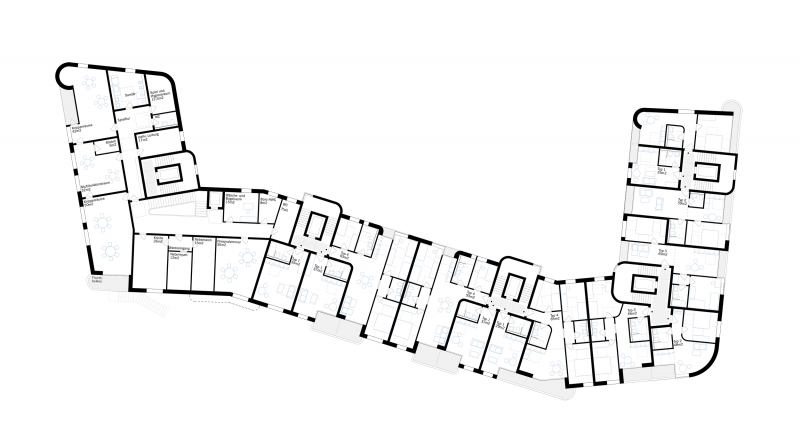 Das Gebäude verändert sich und passt sich, bei gleichbleibenden Prinzipien, an die unterschiedlichen Bedingungen / Situationen des Kontextes an. Der Hof hat eine leicht unterschiedliche Erscheinung sowohl nach außen und innen, als auch zur Straße sowie zum Freiraum des Bahndammes.