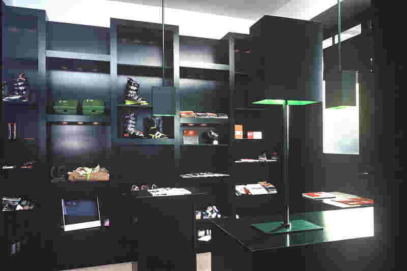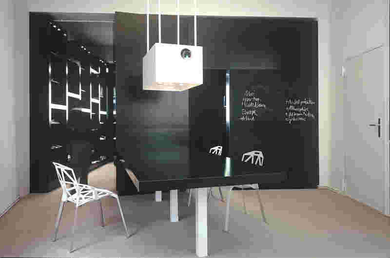 Der Raum wird in zwei Bereiche mit unterschiedlichen Qualitäten aufgeteilt. In einem geheimnisvollen Kabinett mit dunklen Regalen, einer Wandvertäfelung ähnlich, werden die Produkte der Agentur gezeigt. Diese Art der Ausstellung gleicht einer Bibliothek und fördert so die direkte Auseinandersetzung mit den Arbeiten – sie können den Regalen entnommen und auf Stehpulten betrachtet werden.
