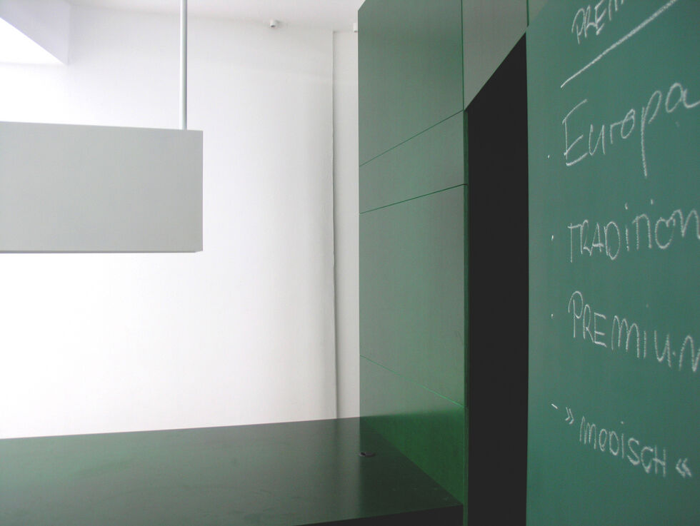 Aus den Regalen wächst der große Tisch in den zurückhaltenden und hellen Besprechungsraum. Der Stahlkörper über dem Tisch dient der Beleuchtung sowie der Projektion mittels dem eingebauten Beamer. In die grüne Regalrückwand ist die Technik (Strom, Netzwerk und TV) und eine Tafel auf die skizziert und notiert werden kann integriert.