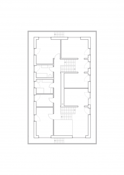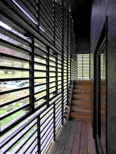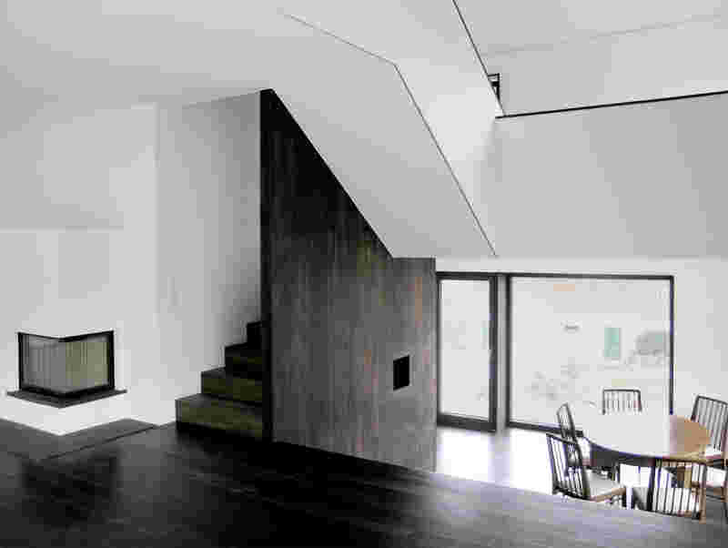 Durch diese Maßnahe und durch große Fassadenöffnungen im Erdgeschoss wird eine starke räumlich Verbindung zum Außenraum hergestellt. Die innere Erschließung des Hauses ermöglicht über zwei gleichartige Treppen vielfältige Raumzusammenhänge und wird durch den umlaufenden Balkon ergänzt. Der umlaufende Balkon, der mit einem Lattenkleid geschützt ist, schafft für die Schlaf- und Kinderzimmer im Obergeschoss ein zusätzliches Angebot: einen Raum, der sowohl Innen-, wie auch Außenraum ist.
