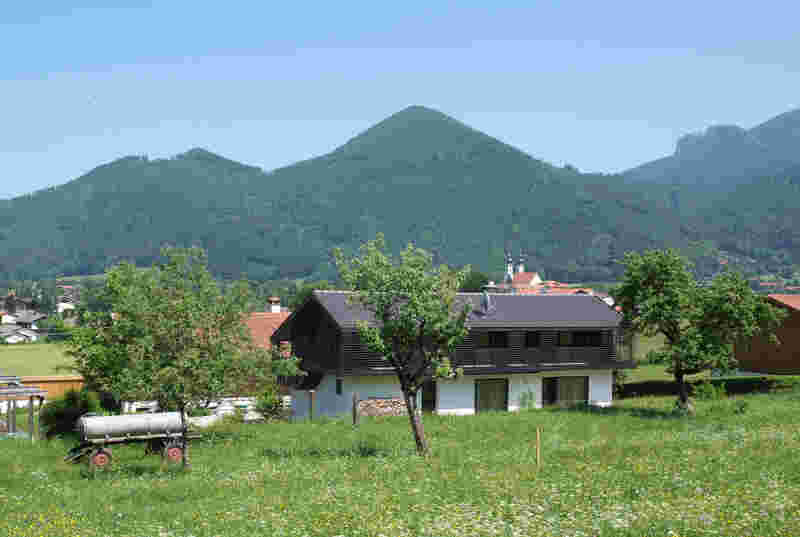 Bei dem Wohnhaus handelt es sich um ein freistehendes Gebäude, situiert auf einem wunderschönen Grundstück in leichter Hanglage mit Blick auf die Kampenwand in einem kleinen Weiler bei Aschau. Abweichend vom Bebauungsplan ist ein kompaktes Gebäude mit einem integrierten Garagenstellplatz entstanden. Der Hangneigung folgend entwickelt sich das Haus in Splitlevels in die Höhe.