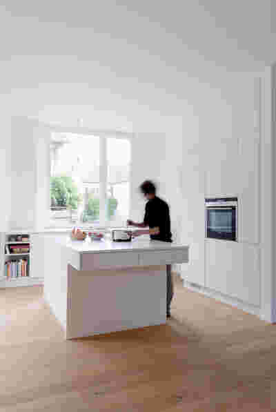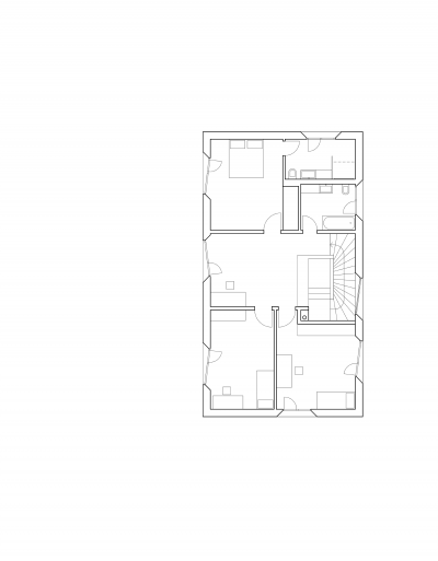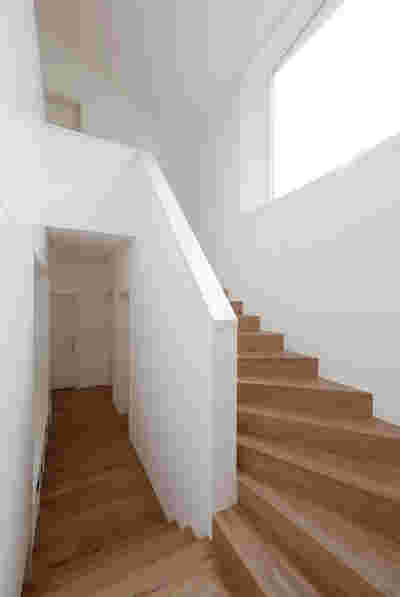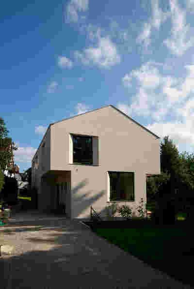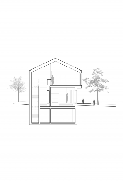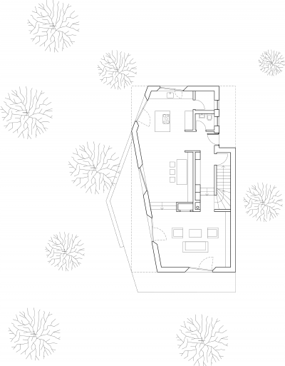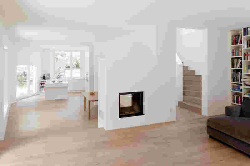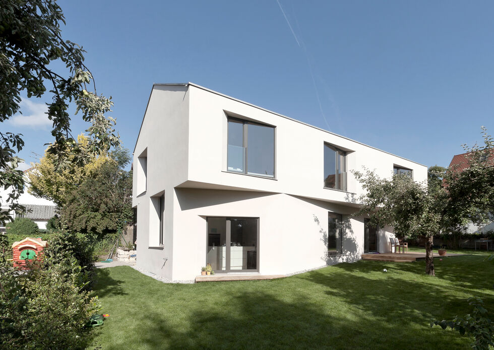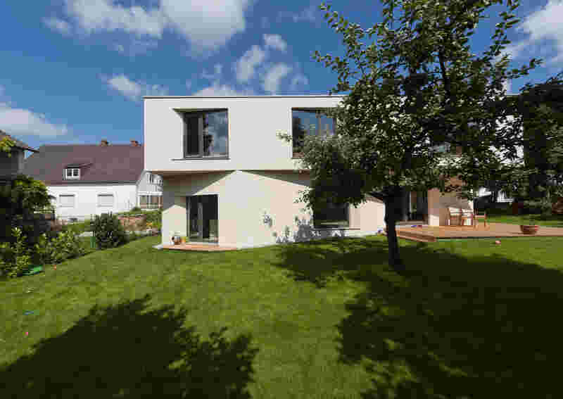 Das Haus ist auf dem leicht geneigten Grundstück so positioniert, dass trotz seiner Größe möglichst viel vom Obstgarten erhalten bleibt. Das Erdgeschoß reagiert zusätzlich auf diese Situation, indem es auf der Gartenseite an zwei Ecken zurückweicht und somit zwei Gartenfassaden bildet. Die großformatigen Fenster stellen eine starke räumliche Verbindung zum Außenraum her und orientieren sich durch ihre schräge Lage in der ebenfalls schrägen Leibung individuell zu den verschiedenen Situationen des umlaufenden Freiraums.