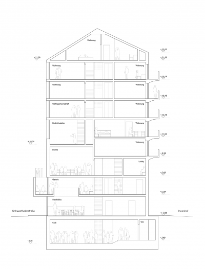 Die für den kulturellen Betrieb wichtigen Räume des Kollektivateliers und der Bühne im Obergeschoß, der Cantina im Erdgeschoß sowie des Clubs im Untergeschoß werden als integrative Bausteine im Gefüge des Hauses erkannt und ermöglichen es den Neuen Münchnern als Gastgeber aufzutreten und die Gäste aus München kennen zu lernen.
