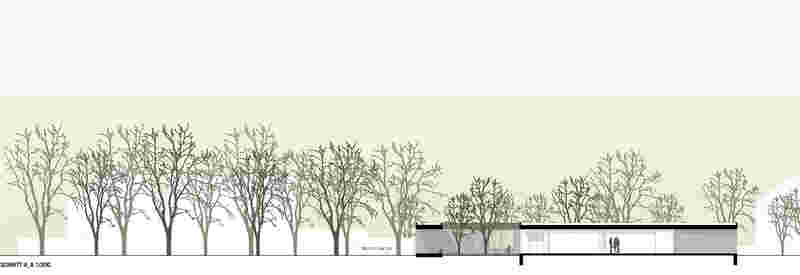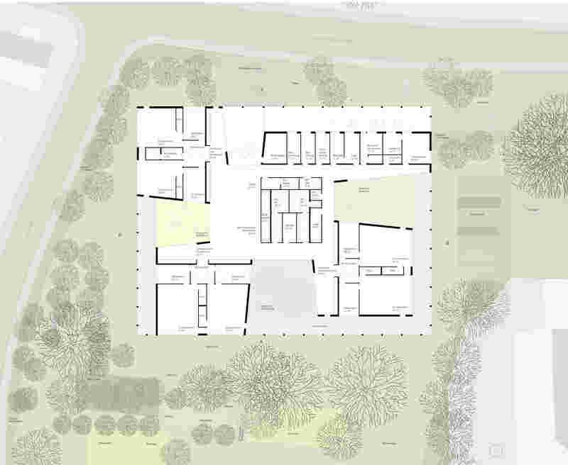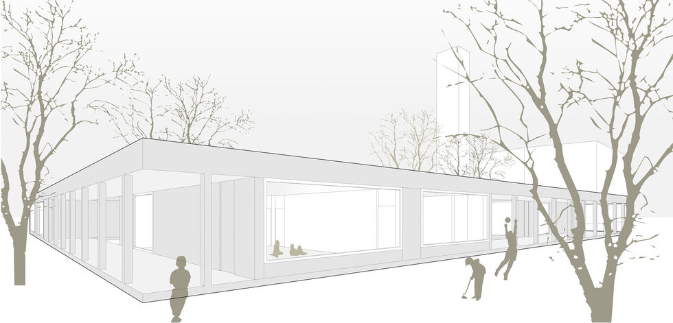 Das neue Kinderhaus nimmt auf die bestehende Kirche und die Gebäude des Pfarrzentrums räumlich Bezug. Es gibt dem bestehenden Kirchplatz im Westen eine klare Platzkante und schließt das Ensemble. Das pavillonartige Gebäudevolumen ordnet sich in seiner Höhenentwicklung klar den umgebenden Gebäuden und dem Baumbestand des Parks unter.