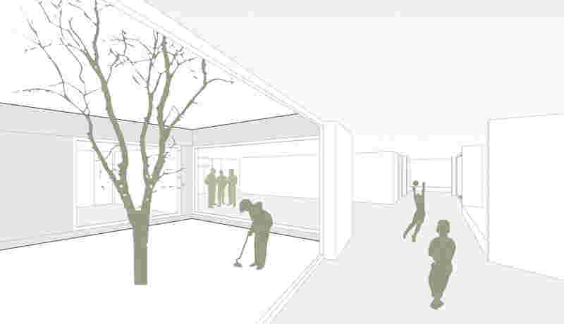 Man betritt das Gebäude im Norden über eine gedeckte Pergola. Das Entree, unmittelbar mit dem Mehrzweckraum verbunden, bildet eine sehr großzügige Eingangs- und Wartesituation. Die Situation dieses verbindenden Raumes schafft kommunikative und räumliche Qualitäten. Ein Teil dieses verbindenden Kontinuums kann als eigenständig zu benutzender Mehrzweckraum mittels Faltwänden abgetrennt werden. Alle Gruppenräume mit den Nebenräumen, den jeweiligen Garderoben in den Aufweitungen zu den Höfen hin, lagern sich an diesen zentralen Raum an.