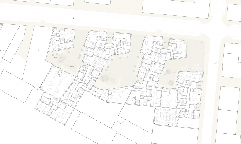 Diese neuen, polygonal gefassten Höfe, unterscheiden sich in Dimension und Form. Von den sehr öffentlichen Zonen des neuen Platzes und der Zwischenräume entlang der Flaschenhofstraße nimmt die Privatheit der Höfe nach Süden hin mit dem terrassierten Terrain ansteigend, immer weiter zu. Unterstützt wird die differenzierte Gestaltung der Höfe durch eine unterschiedliche Farbgebung der Bausteine. Der nördliche Teil der Flaschenhöfe ist befestigt und dient als Übergang von der Stadt ins Innere, wird aber auch der Rolle als Entree im östlichen und Westlichen Wohnhof gerecht. In den höher gelegenen Teilen der Höfe, auf mittlerem Niveau, werden Bäume gepflanzt. Auf dem obersten Niveau finden sich Kinderspiel und private Zonen der Hausgemeinschaften. Zusätzliche Nutzungen durch gemeinschaftliche Nutzgärten sind auf dieser Ebene vorstellbar.