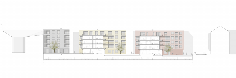 Lange, aus einzelnen Häusern gefügte Bausteine strecken sich, dem Verlauf des vorgefundenen Geländes folgend, in Geschoßigkeit und Tiefe variierend, von Südwesten nach Nordosten und enden an der Flaschenhofstraße mit prägnanten, städtischen Wohnhäusern. Die Höfe zeigen sich offen zur Flaschenhofstraße. Der im Osten gelegene kleine Platz weitet den Straßenraum zusätzlich auf und formt einen räumlichen Auftakt zum neuen Quartier entlang der Neudörferstraße.