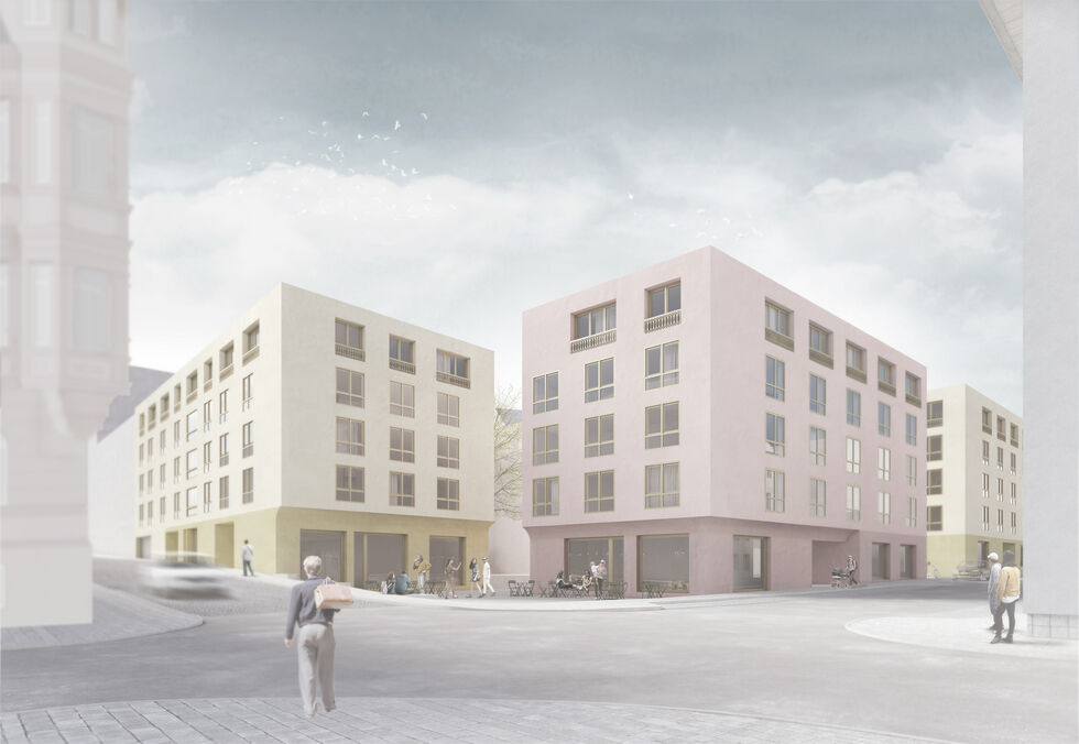 Die einzelnen Häuser fügen sich zum stadträumlichen Hofgewebe. Die Häuser entlang der Flaschenhofstraße und der Neudörferstraße bilden eine klare Sockelzone mit erhöhtem Erdgeschoß aus. Im oberen Bereich der Fassaden sitzen bündige Fenster in der äußersten Putzebene der Häuser. Sie unterstreichen den präzisen Rhythmus der Durchgänge zu den Höfen. Im obersten Geschoß bilden großzügige, atelierhafte, eingezogene Öffnungen den oberen Abschluss der Häuser.