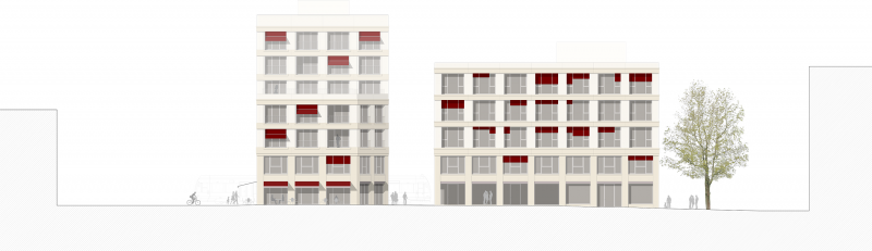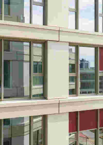 Die beiden Gebäude zeigen sich als elegante offene Häuser. Die Fassaden gliedern sich in beiden Bauteilen vertikal in eine öffentliche Erdgeschoßzone mit einem darüber angeordnetem Geschoß, dessen außen bündige Fenster den Eindruck eines gemeinsamen, städtischen Sockels verstärken, und beide Gebäude in einen starken Zusammenhang bringen. Die Fassade wird aus glatten (gesäuert) und rauhen (gestrahlt) Betonfetigteilen gefügt. Über dieser verbindenden Sockelzone entwickeln sich beide Häuser entsprechend Ihrer Nutzungen differenziert. Im Bürohaus ist die Fassade mehr als durchgängiges Band gedacht im Wohnhaus mehr als einzelnes Fenster. Dabei bleiben sie in Proportionen und Materialität verwandt.