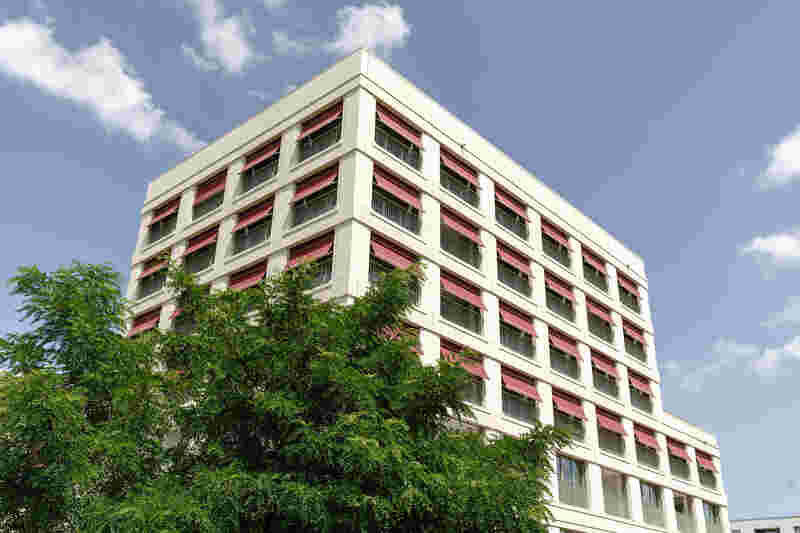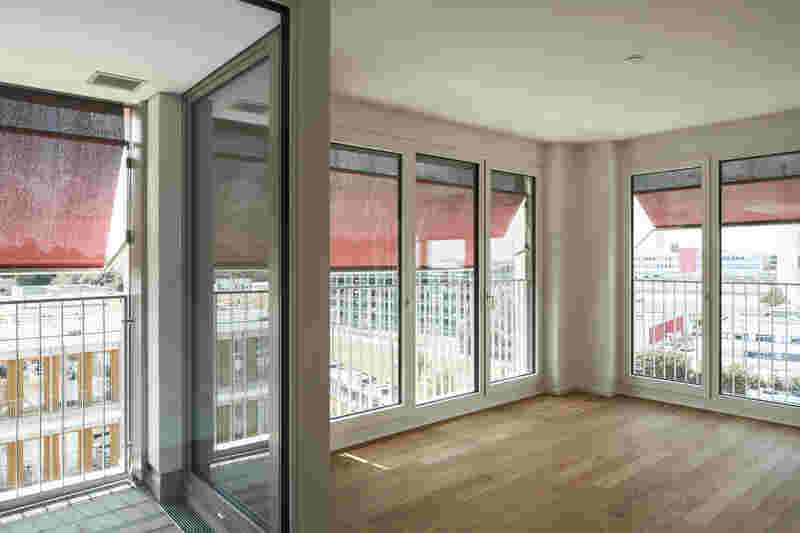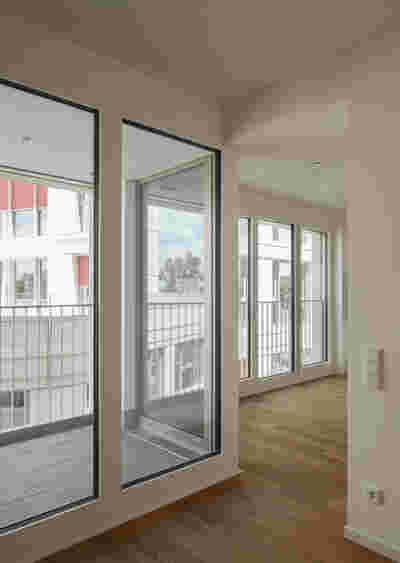 Im Hochpunkt in den oberen fünf Etagen finden sich gut belichtete, verschieden große Wohnungen, die nach Südwest und Südost orientiert sind und überwiegend die Schule im Süden überblicken.