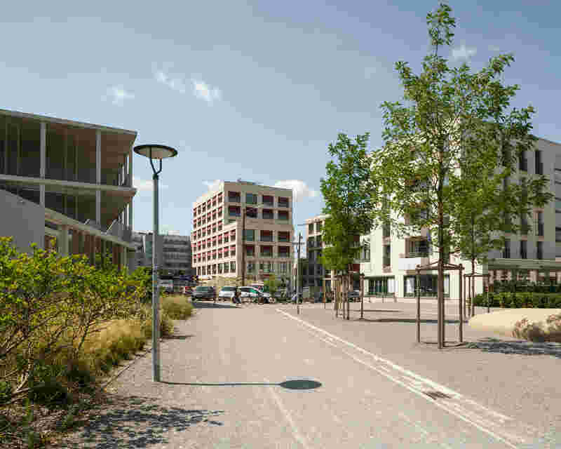 Der Hochpunkt im Südwesten stellt einen angemessenen Maßstab zu dem übergeordneten Freiraum mit Trambahnhalt dar und wirkt als Zeichen für den neuen Stadtteil. Vereinzelt gesetzte Freiraumelemente wie Baumpflanzungen kombiniert mit Bankelementen und Schnitthecken zonieren den Freibereich ohne die Durchlässigkeit und Querbezüge zu stören.