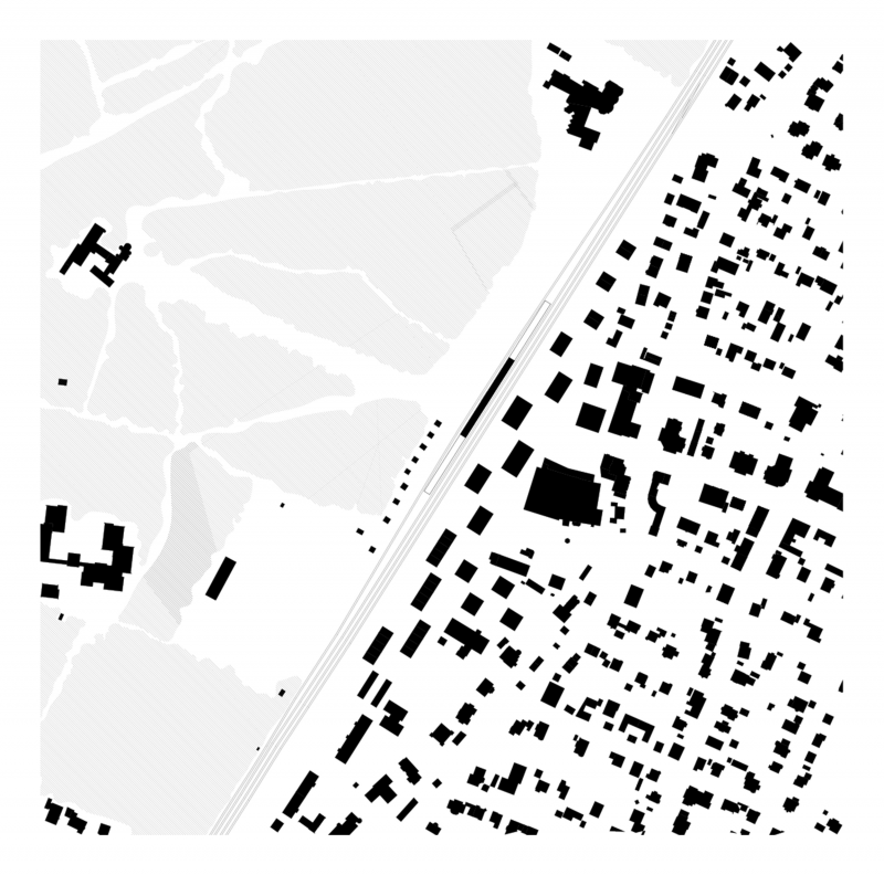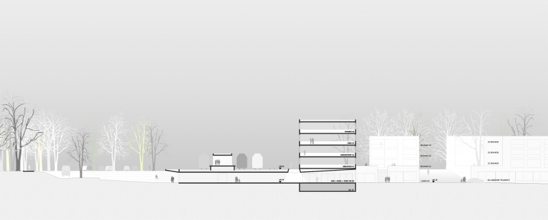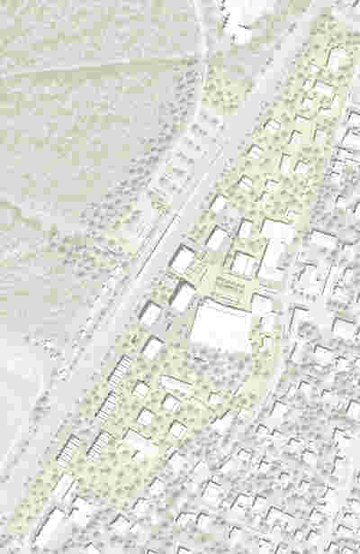 Die vorgeschlagene Bebauung mit Gebäuen unterschiedlicher Körnung und Hähe entlang der Gleise setzt einen starken städtebaulichen Akzent. Um den besonderen Anforderungen als Endpunkt der Bahnhofstraße, als Knotenpunkt für den öffentlichen Verkehr sowie als Startpunkt für Ausflüge ins Umland gerecht zu werden, gruppieren sich neue und best. Gebäude um einen großzügigen Stadtplatz, der Planegg eine Identität an den Geisen gibt.
