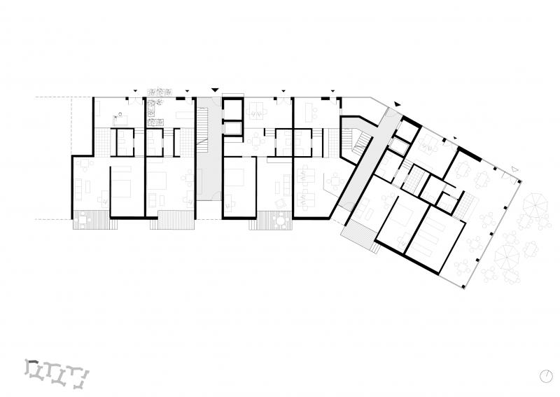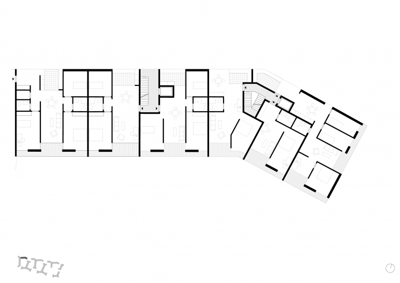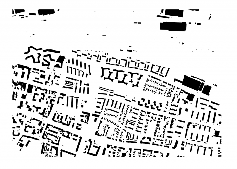 Sechs mehrschenklige Figuren sind gleichmäßig über das Grundstück verteilt und bilden eine homogene städtebauliche Textur. Diese Textur ist in ihrer Eigenständigkeit den Texturen der Nachbarschaften ähnlich. Die Arme formen nach Außen gewendete Nischen – urbane Platzsituationen und landschaftliche Crescents - die sich jeweils unterschiedlich der Landschaft im Süden und der Stadt im Norden zeigen.