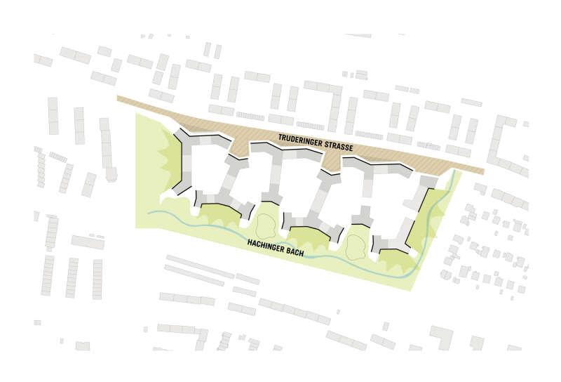 Die Aufwertung der Truderinger Straße durch die neue Bebauung mit zusätzlichen verschiedenen Angeboten für die Nachbarschaft ist, neben der Schaffung eines Quartiers das sich trotz der hohen Dichte gut einfügt und hohe Wohnqualitäten bietet, ein wichtiges Ziel. Das Quartier soll die wichtigen Räume - die Truderinger Straße mit dem Freiraum Hachinger Bach - gut vernetzen und zugleich ein eigenständiger, wiedererkennbarer Player im heterogenen Kontext werden.