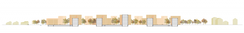 An den Rändern im Westen und im Osten öffnet sich die Bebauung in ähnlicher Art zum Freiraum. Die Bebauung bildet fünf Höfe aus und garantiert so funktionierende Rückzugsräume und viele Orte für die Gemeinschaft. Die Höfe sind im Charakter ähnlich geprägt durch die durchfließende, fast wilde Landschaft. Zwei der Höfe sind frei von Gebäudeerschließung, Feuerwehr und Kindertageseinrichtungen. Dadurch ergeben sich stärker belebte und ruhigere Höfe im Wechsel. Die Wohnungen sind durchgesteckt und profitieren von beiden Seiten und Qualitäten.