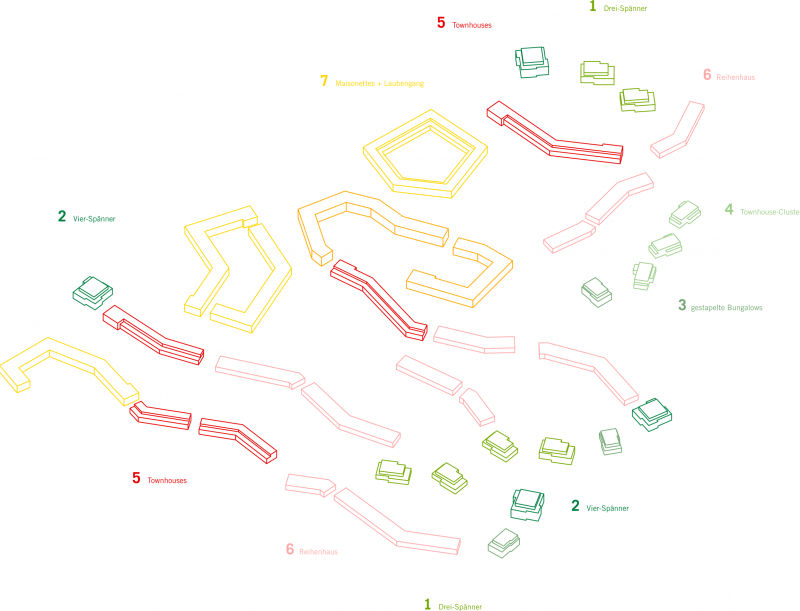 Im Gebiet finden sich sehr unterschiedliche Typologien. Grundsätzlich war es uns ein großes Anliegen möglichst viele Alternativen zum freistehenden Einfamilienhaus zu entwickeln. Ein weiteres Ziel war Wohnformen anzubieten, die verschiedene Wohnungsgrößen zulassen. Es gibt sehr kleine (Auszubildende, Singles) und sehr große Wohnungen (Loftwohnen als Familie, betreute WGs), so dass in allen Lebensphasen im Quartier gewohnt werden kann.