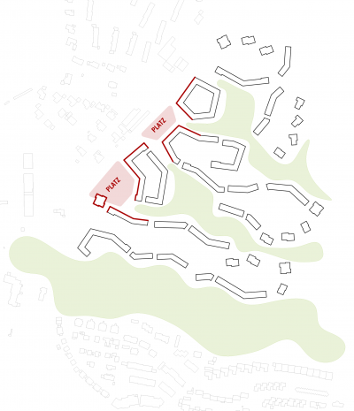Die neue Bebauung bildet entlang der Sternschanzenstrasse sehr unterschiedliche Übergangsräume aus. Über zwei Platzräume wird das neue Quartier mit dem bestehenden Siedlungsteil verwoben. Am Quartiersplatz finden sich öffentliche Nutzungen: Läden, Cafes, Praxen, der Ausstellungspavillon. Der nördlichere Platz ist dagegen mehr von gemeinschaftlichen Einrichtungen geprägt und deutlich „grüner“. Über diesen angerartigen Platz gelangt man in zwei größere landschaftlich geprägte Räume, sogenannte Landschaftshöfe. Sie vernetzen die Parkstadt mit der Landschaft, hier finden sich Mulden zur Retention. Die Landschaftshöfe lassen das Dahinterliegende erahnen und bringen so die Qualitäten der im Osten gelegenen freien Landschaft ins Quartier.