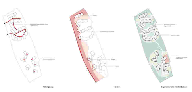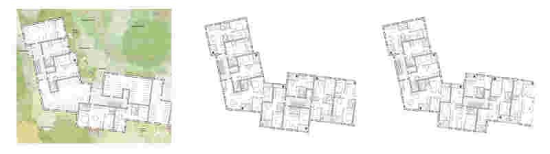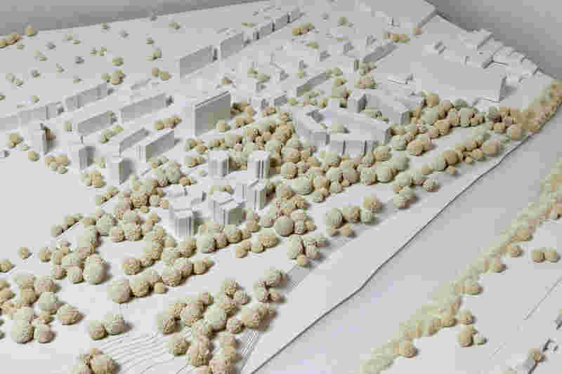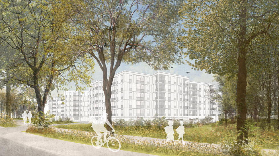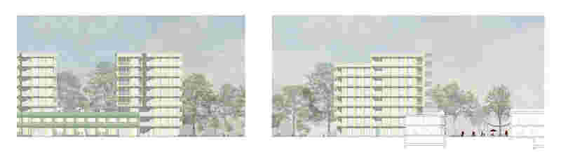 In der Typologie der sich auffaltenden und abknickenden Körper, verwachsen die Gebäude im Nordteil mit der Parklandschaft. Die Staffelung aus Adressier- und Grünhöfen macht das Wohnen im Park erlebbar und erlaubt die Querung durch das Wohnquartier. Im Übergang zum Straßenraum der Berliner Allee weicht die als Köpfe ausgebildete Schallschutzbebauung dem beeindruckenden Baumbestand und der darunterliegenden Topographie aus. Die Körper knicken alternierend entlang der Berliner Allee, es entsteht eine spannungsvolle räumliche Staffelung von Straßenraum, Baumkronen und Baukörpern, deren Ausrichtungen und Lücken auf das Dahinter hinweisen und gleichzeitig die weitere Bebauung vom Schall der Straße abschirmen. Das nördlich angrenzende Gewerbegebiet wird durch den sowohl als Mobilitäts- als auch als Quartierszentrum genutzten Baustein abgeschirmt. Dieser wirkt durch seine vielseitigen öffentlichen Nutzungen als Vermittler in der sich im Wandel befindenden Nachbarschaft. Das südliche Quartier greift das Thema der Lichtung im Park auf. Punkthäuser säumen diese Lichtung und werden durch einen zweigeschossigen Horizont miteinander verbunden. Zum Inneren bildet sich ein städtischer Binnenraum, der durch gezielte Öffnungen starke Bezüge zum Lechpark aufbaut. Die achtgeschossigen Baukörper fächern sich abgetreppt in den Parkraum und ermöglichen so die Orientierung jeder Wohnung ins Grüne. Der städtische Binnenraum erlebt durch die Anordnung eines Folly bilden Mobility Hub und Nachbarschaftszentrum einen aneignungsfähigen Quartiersmittelpunkt.