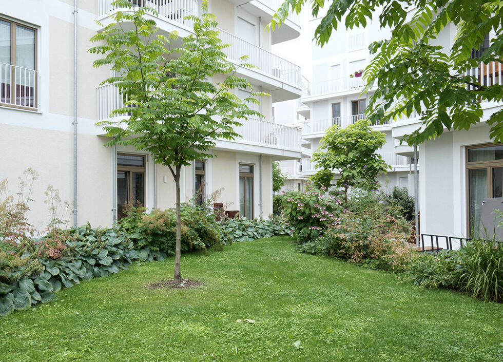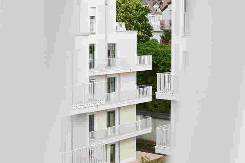 Die knapp vor den Gebäuden verlaufenden durchgängigen Balkone geben den Wohnungen einen individuellen Freiraum, an den Loggien verbreitern sich diese sonst schmalen Bänder zu großzügigen grünen Zimmern.