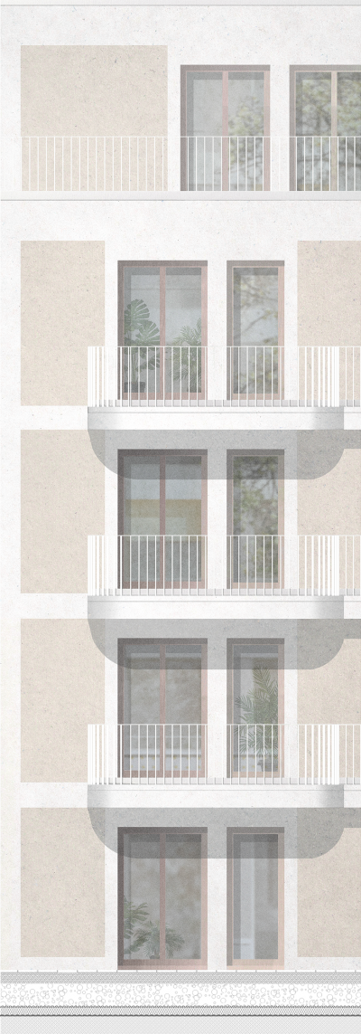 Die Gebäude werden als Massivbauten in Stahlbeton mit einem verputzten, glatt gefilzten Wärmedämmverbundsystem ausgeführt. Die Gestaltung der Fassaden referenziert dabei auf die leichte Eleganz der charakteristischen Häuser der 1950er Jahre in der Maxvorstadt. Die neuen Gebäude verfügen über ein hohes Maß an Individualität und sind als einzelne Bausteine erkennbar. Die einzelnen Wohnungen sind variabel in Größe und Grundriss und bieten durch die Schaffung verschiedener Typologien eine flexible und lebendige Mischung im Gefüge.
