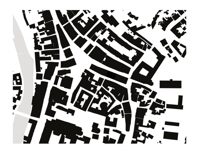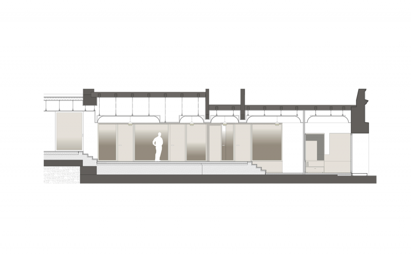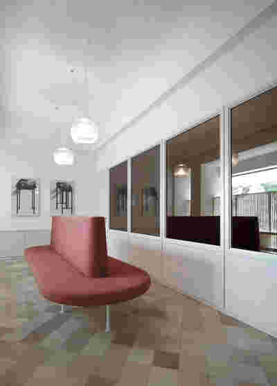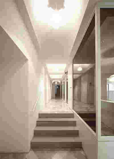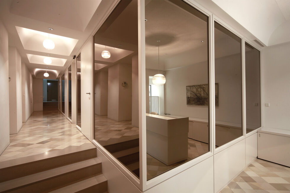 Um den Höhenunterschied der beiden Straßen zu überwinden, staffeln sich die verschiedenen Bereiche der Zahnarztpraxis: Empfangs-, Behandlungs- und Laborbereich auf verschieden hohen Ebenen vom Öffentlichen ins Private. Die öffentlichen Bereiche erhalten mit einem Bodenbelag aus Solnhofer Platten einen sehr ortstypischen Bodenbelag.